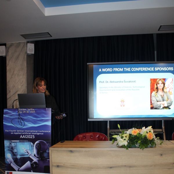 Државна секретарка у Министарству науке, технолошког развоја и иновација проф. др Александра Шуваковић свечано је отворила Четврту српску међународну конференцију о примењеној вештачкој интелигенцији ,,AAI2025” на Златибору, коју организује Универзитет у Крагујевцу уз подршку Министарства науке, технолошког развоја и иновација Републике Србије
